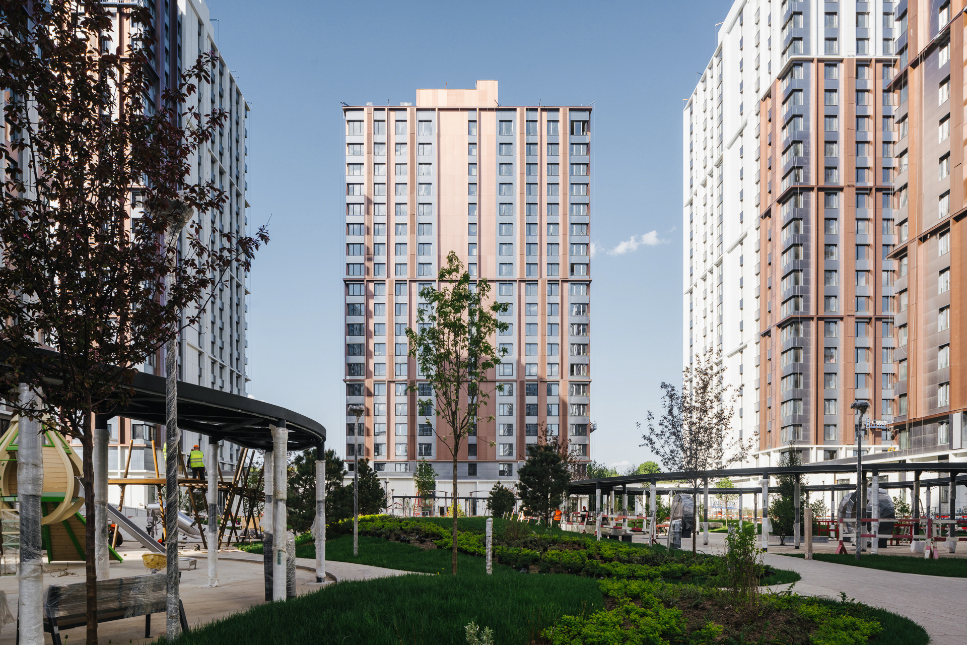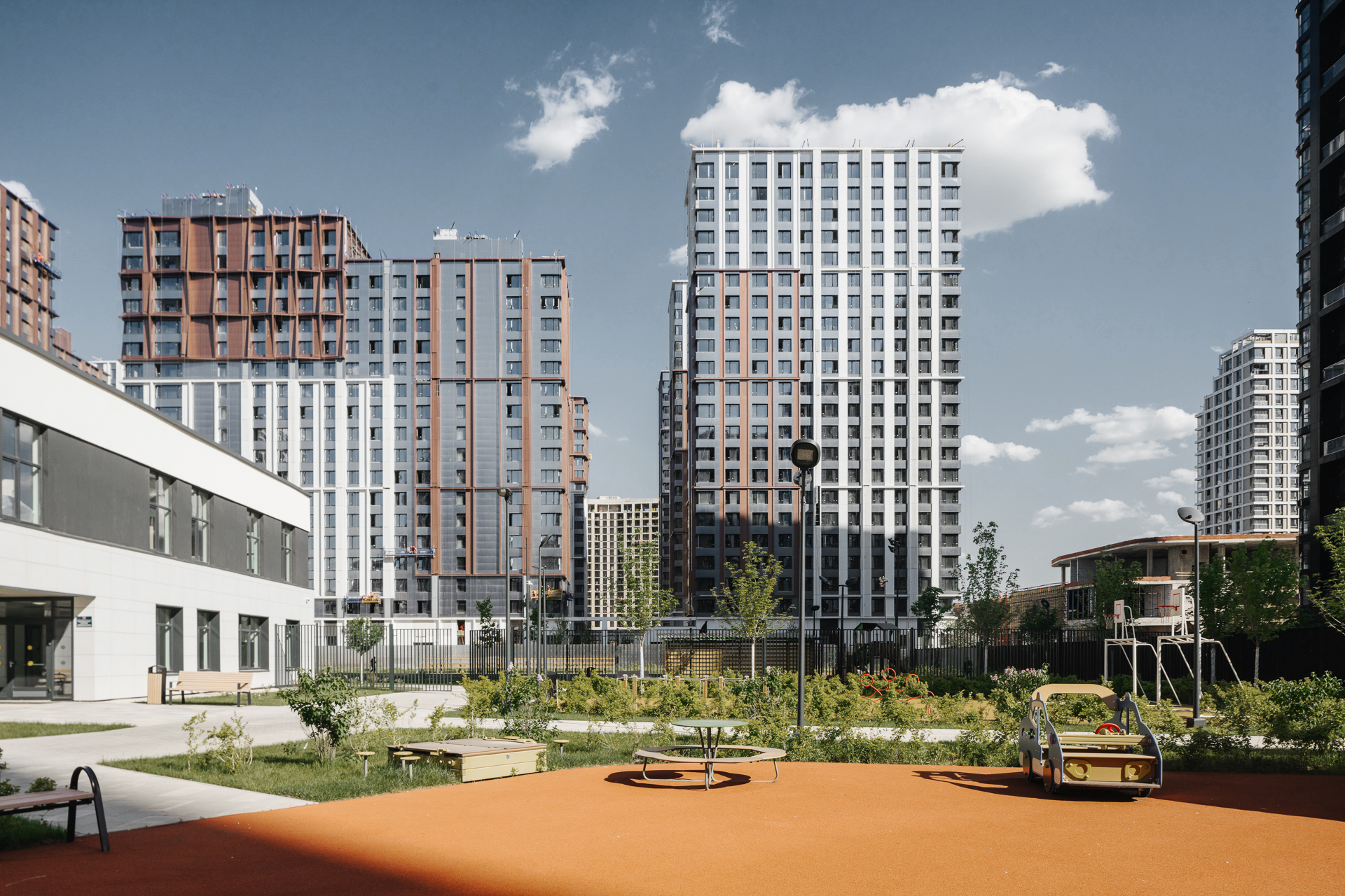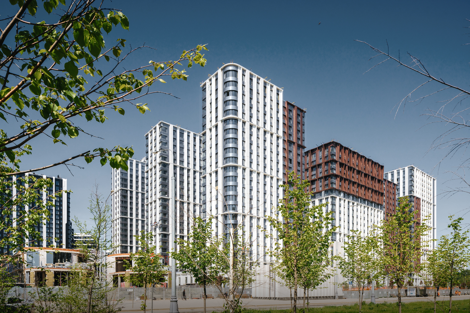 — Каждый корпус визуально разделяется на несколько объемов за счет использования разных фасадных тем и колористических решений. На большей части — это светлые материалы с акцентными вставками темного цвета.