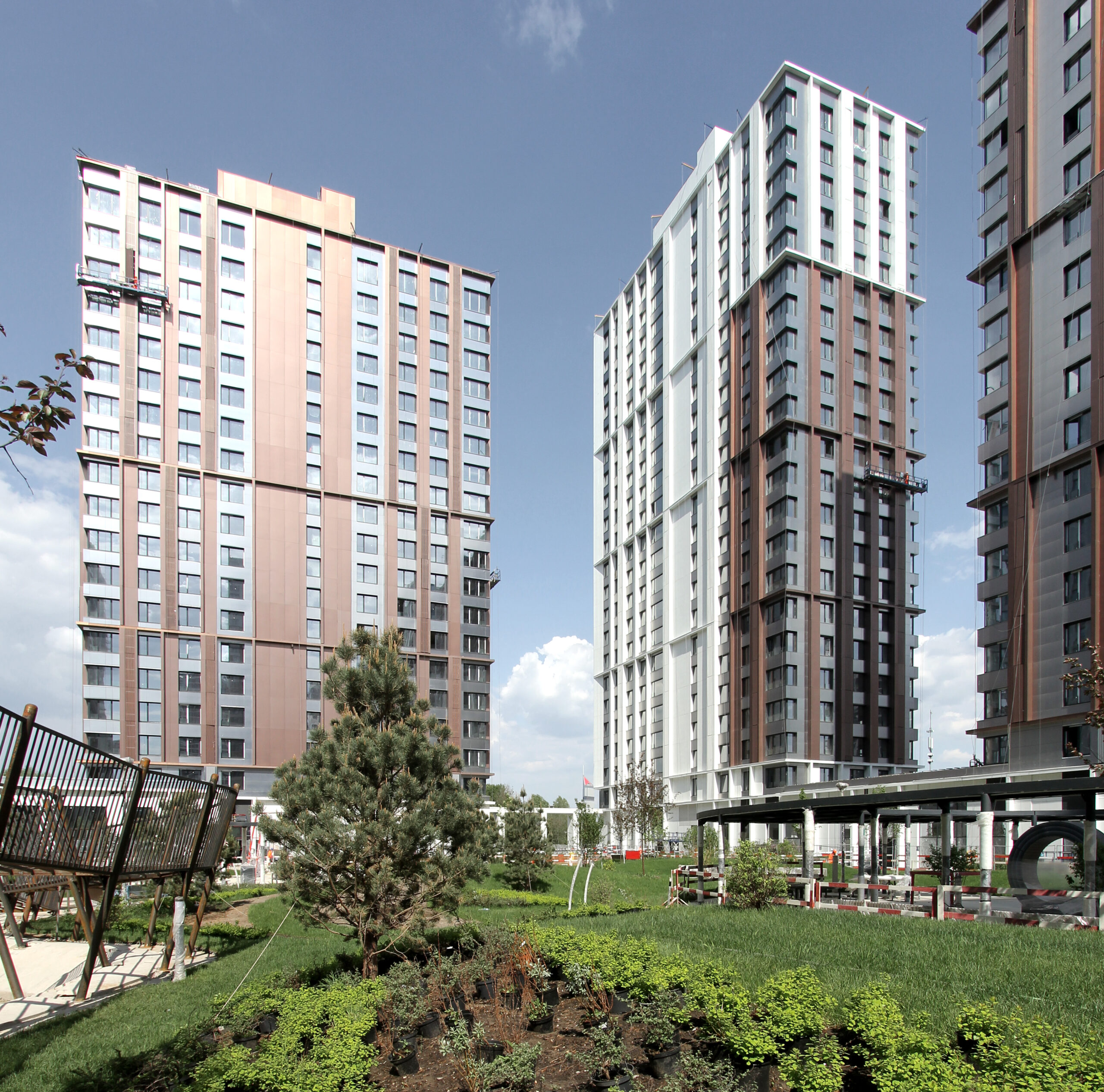 Периметральное расположение корпусов создает замкнутый объем комплекса, а угловые башни и секционные дома между ними формируют силуэт застройки.